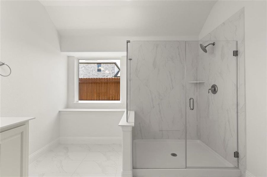 The private primary suite is thoughtfully positioned on the opposite side of the home from the secondary bedrooms, creating a serene retreat complete with additional windows, two generous walk-in closets, and a convenient private door from the main closet directly into the utility room. The spa-inspired primary bath includes a frameless glass shower and dual vanities for added ease.