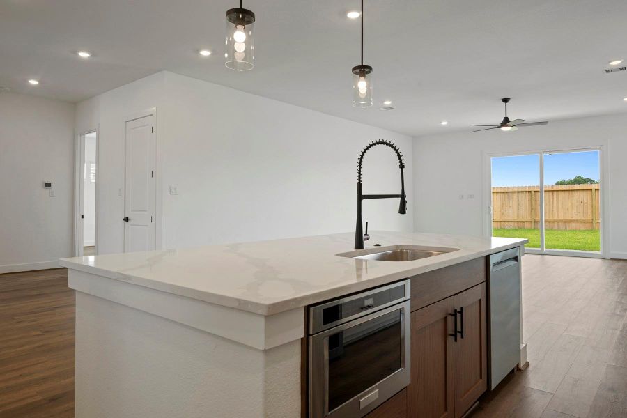 Beautiful cabinetry, quartz countertops, and a spacious center island provide the perfect backdrop for