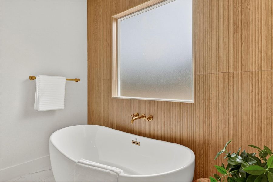 The chef’s kitchen is open to the living and dining areas and features a large quartz waterfall island, custom cabinetry, and premium fixtures. A dedicated office makes working from home effortless, while the three bedrooms and two and a half baths offer comfort and privacy for everyone. The primary suite is a true retreat, boasting a spa-like bathroom with a freestanding tub framed by a pine-paneled accent wall, a spacious walk-in shower with marble tile, a rain shower head, and a frameless glass enclosure.