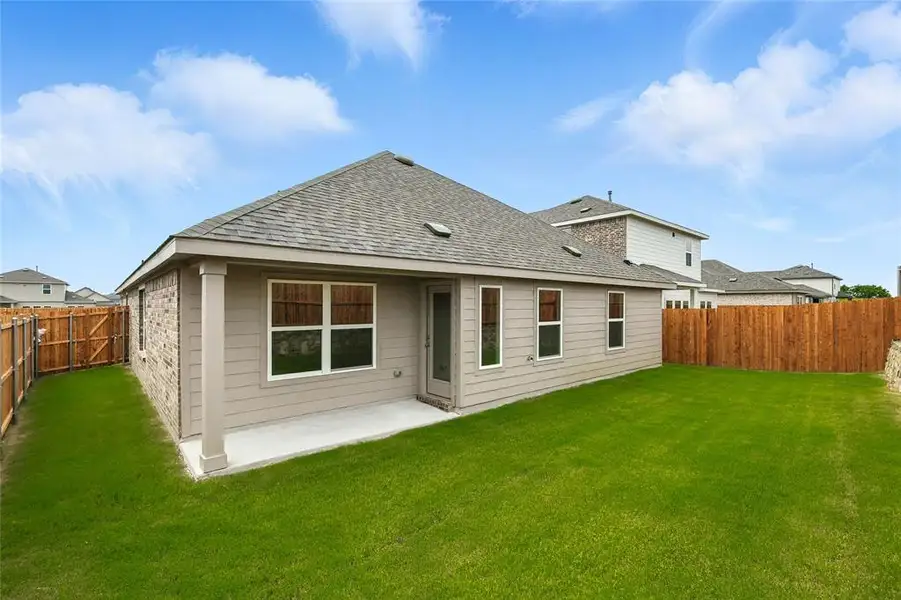Welcome to The Kimbell, a beautifully designed single-story Brightland Home that offers 1,989 square feet of stylish and functional living space. This home has been thoughtfully crafted for modern living, featuring an open-concept layout that seamlessly blends comfort and convenience throughout its inviting interiors. The chef-inspired kitchen serves as the heart of the home, showcasing abundant cabinetry, and sleek stainless steel appliances. A central island provides additional workspace and is perfect for casual dining or gathering with loved ones. The adjacent large pantry offers generous storage. Flowing from the kitchen, the spacious great room is bathed in natural light, creating a warm and inviting environment for both everyday family life and entertaining guests. The private owner’s suite is strategically separated from the main living areas to provide added privacy and tranquility. It includes a generously sized bedroom with ample natural light and a spa-like ensuite bathroom. The ensuite features a dual sink vanity, a large shower with decorative tile accents, and a spacious closet that offers plenty of storage space. Three thoughtfully designed additional bedrooms are located in their own wing of the house, making them ideal for children or guests. A study at the front of the house can serve various purposes, such as a playroom or hobby space, depending on your needs. Located within the vibrant Patriot Estates community, residents have access to a wealth of amenities, including beautifully maintained green spaces, scenic walking trails perfect for morning strolls, and a sparkling community pool to help beat the Texas heat. The fun-filled playground provides a safe space for children to play and explore. Plus, with easy access to a variety of dining options, retail shops, and entertainment venues in nearby Midlothian, everything you need for a fulfilling lifestyle is just minutes away.