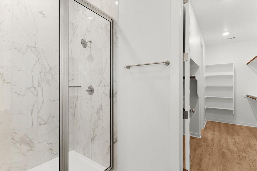 Tucked privately in the back of the home, the primary suite offers a tray ceiling and double doors into an ensuite bath with two walk-in closets—one connecting directly to the laundry room for laundry-day ease. The bath also includes a dual vanity separated by a window seat, a walk-in shower, and a linen closet.