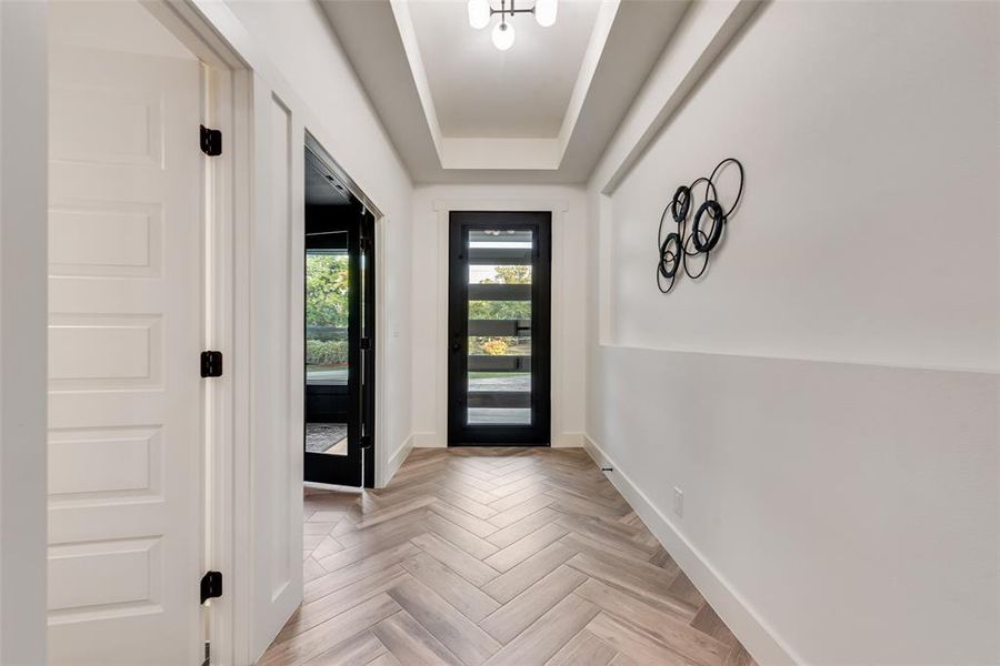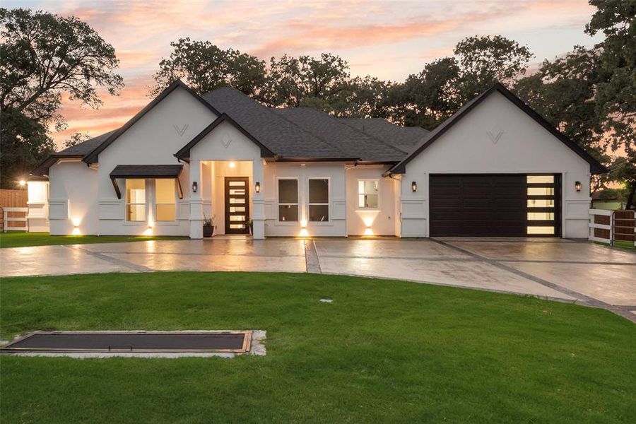 Welcome to this stunning, brand-new custom home tucked away on a quiet street just minutes from Eagle Mountain Lake! Located outside city limits with no HOA, this masterfully designed one-story home combines luxury finishes with everyday functionality. Inside you will find an inviting office with French doors and a custom feature wall, perfect for working from home. The open-concept living, kitchen, and dining area features vaulted ceilings with an exposed beam, built-in shelving, and beautiful wood-look tile flooring throughout - no carpet in the entire house! The kitchen includes stunning quartz countertops, a waterfall island, custom cabinetry, and statement lighting. The spacious primary suite offers serene views of the lake, a massive walk-in closet, and a spa-like en suite bath. Two additional bedrooms share a full bath, and the third bedroom could act as a second primary with its own private en-suite bath. There's a separate guest half bath that features a floor-to-ceiling tile, the laundry room is equipped with ample cabinetry and room for an additional fridge. The oversized two-car garage includes epoxy floors and extra space for storage with the mudroom conveniently located right when you walk in from the garage. Step outside and enjoy your large covered patio - perfect for entertaining - while the spacious corner lot provides peace, privacy, and plenty of room to roam. A circular driveway add extra convenience and curb appeal. This home has it all - custom design, high-end finishes, and a prime location near the lake, 10 minutes from Azle, 15 minutes from Lake Worth, and 25 minutes from Downtown Fort Worth!
