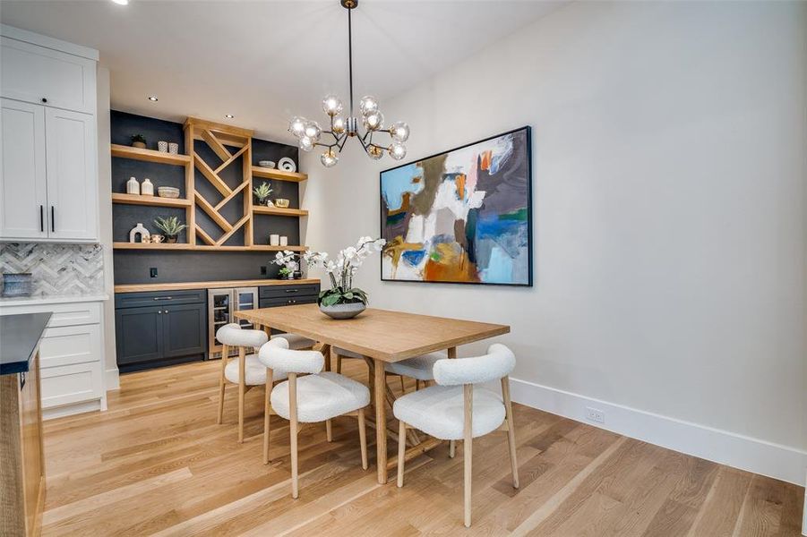 Additional highlights feature an oversized laundry room, a speak-easy style pantry, and high-end finishes like solid white oak hardwood floors, carbon leathered quartz countertops, and custom white oak cabinetry. The home is equipped with high-efficiency systems, including dual zone 5 ton TRANE HVAC units, thermally Low E double panel windows, and custom fiberglass exterior doors, all contributing to a cost-effective and eco-friendly living environment.