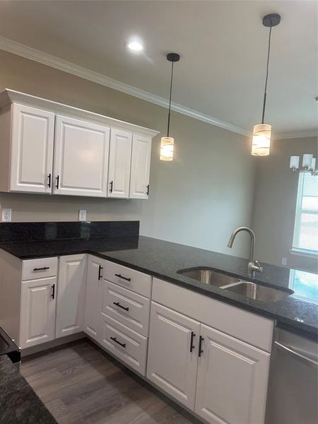 This stunning 3-bedroom, 2-bath home with a 1-car garage offers a modern and functional design. The open-concept kitchen features a spacious island with an integrated sink, highlighted by stylish pendant lights and sleek black granite countertops. All-electric appliances and waterproof laminate flooring throughout combine style with long-lasting durability.
