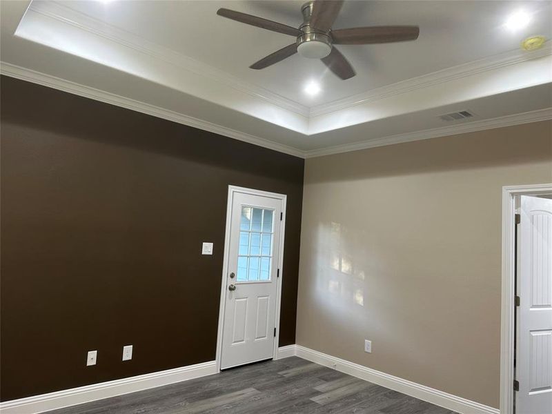 The living area is enhanced by a box ceiling with crown molding and energy-efficient LED lighting, creating a cozy yet sophisticated ambiance. Hallways and entryways feature arched ceilings, adding architectural charm and elegance throughout the home.