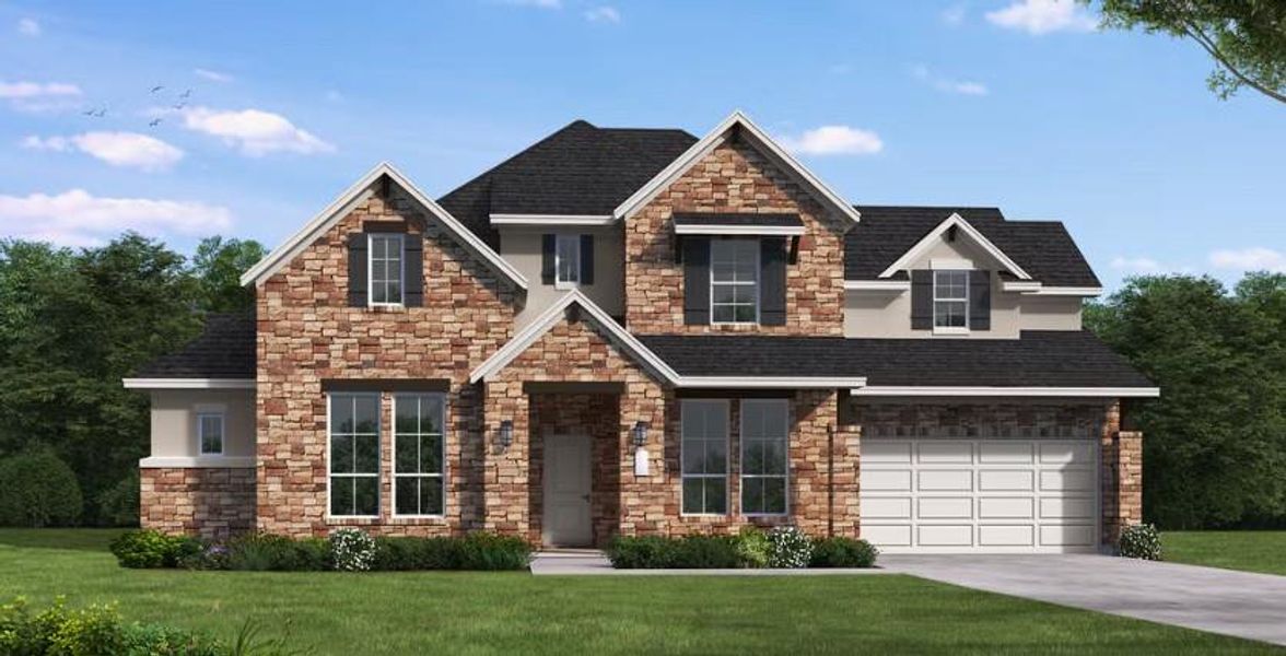 New Coventry Home! Experience the superior design and functionality of our most popular Weston floor plan. Enjoy excellent curb appeal with this home's beautiful gray stone and stucco elevation with a covered porch. The grand foyer greets you with a 20' ceiling and dramatic curving staircase, opening to the great room with a gas-log fireplace surrounded by stunning floor-to-ceiling tile. Wood floors extend throughout the main living areas, plus the study, game room and primary bedroom. The kitchen features two-tone white shaker cabinets with trash pull-out, pot and pan drawers, designer tile backsplash, stovepipe vent hood, single bowl sink, and desirable quartz counters. The large covered patio and roomy yard are perfect for entertaining. Retreat to the luxury primary suite with split sink vanities, a garden tub, and a tiled walk-in shower with a seat. A secondary bed and bath are also conveniently located on the first floor. Upstairs, you will find a second game room and three additional bedrooms. Located in the much-desired Wolf Ranch, enjoy two amenity centers with multiple pools, sports courts, nature trails, parks, and more! ** Ask us about our low interest rates & special financing! Visit Onsite for details – subject to change without notice. **