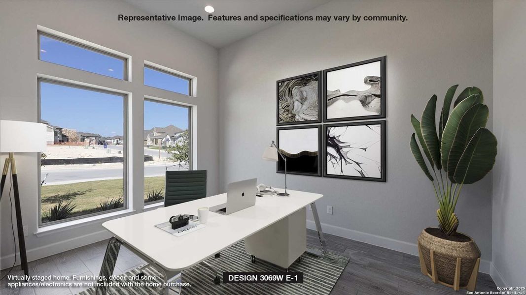 Home office with French doors frame entry. Open family room with a wood mantel fireplace and wall of windows extends to kitchen and dining area. Island kitchen with built-in seating space, 5-burner gas cooktop and a walk-in pantry. Game room with French doors just off the family room. Private primary suite with wall of windows. Primary bathroom features a French door entry, dual vanities, freestanding tub, separate glass enclosed shower and two walk-in closets. Guest suite with full bathroom and walk-in closet. Additional bedrooms with walk-in closets a half bathroom and Hollywood bathroom completes this design. Extended covered backyard patio and 5-zone sprinkler system. Utility room and mud room off the three-car garage.
