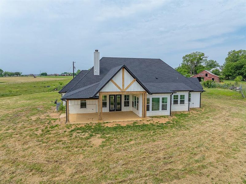 Welcome to this beautifully designed modern farmhouse nestled on 2 expansive acres, offering the perfect blend of comfort, function, and style. With 4 spacious bedrooms, 3 full bathrooms, and a versatile bonus room upstairs featuring wood-look laminate flooring, this home is ideal for families of all sizes. The first level boasts stained concrete floors throughout, creating a seamless and durable living space. The open-concept layout connects the kitchen, dining, and living areas, with a stunning wood-burning fireplace anchoring the living room. The kitchen is a chef's dream, featuring sleek granite countertops, white shaker-style cabinets, subway tile backsplash, and a large island perfect for gathering. Enjoy plenty of natural light from the abundant windows throughout the home. The master suite, laundry room, and one secondary bedroom and bathroom are privately tucked behind the kitchen, while the other two bedrooms are located on the opposite side of the home with a full bathroom to share is situated between them — an ideal setup for privacy. Step outside to the covered back porch, perfect for entertaining or enjoying peaceful views of the surrounding landscape. Whether you're hosting a barbecue or sipping your morning coffee, you'll love the outdoor space this property provides.