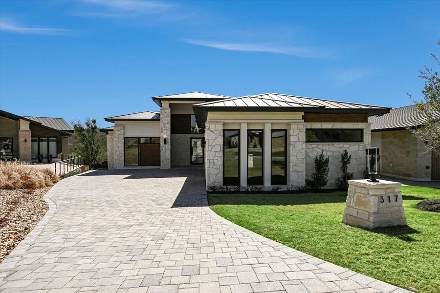STUNNING NEW CONSTRUCTION IN SUMMIT ROCK-GOLDEN BEAR READY FOR IMMEDIATE MOVE IN! The transitional/modern prairie style home built by Crescent Estate Custom Homes is perfectly situated N/S facing on a private cul-de-sac lot that backs to a seasonal creek, trees and the 18th Fairway of the exclusive Summit Rock golf course. This lot is not only beautiful and quintessential Hill Country, but it is plenty large for a private pool and spa at the base of the back balcony staircase. This single story, 3390 sqft masterpiece is offered as a 4 bdrm or 3 bdrm plus a study or den/flex room with 4 full baths and one powder bath. The large open floorplan flows effortlessly from entrance to living to dining to the fully equipped kitchen complete with top-of-the-line Thermador appliances, and to the catering kitchen/wet-wine bar complete with sink, dishwasher and beverage refrigerator. With the focal points of the main living areas being the porcelain faced floor to ceiling fireplace and the stunning complimentary black with white veining quartz island in the main kitchen the large open space is balanced beautifully. Gorgeous warm dark stained custom cabinets are highlighted with white quartz countertops and the lighting throughout is sophisticated and striking. This home lives inside out with ease. The primary suite and bathroom are a lesson in combining textures that are classic yet trending. Come see for yourself and take advantage of the Developer paid Summit Level initiation fees valued at over $200,000.