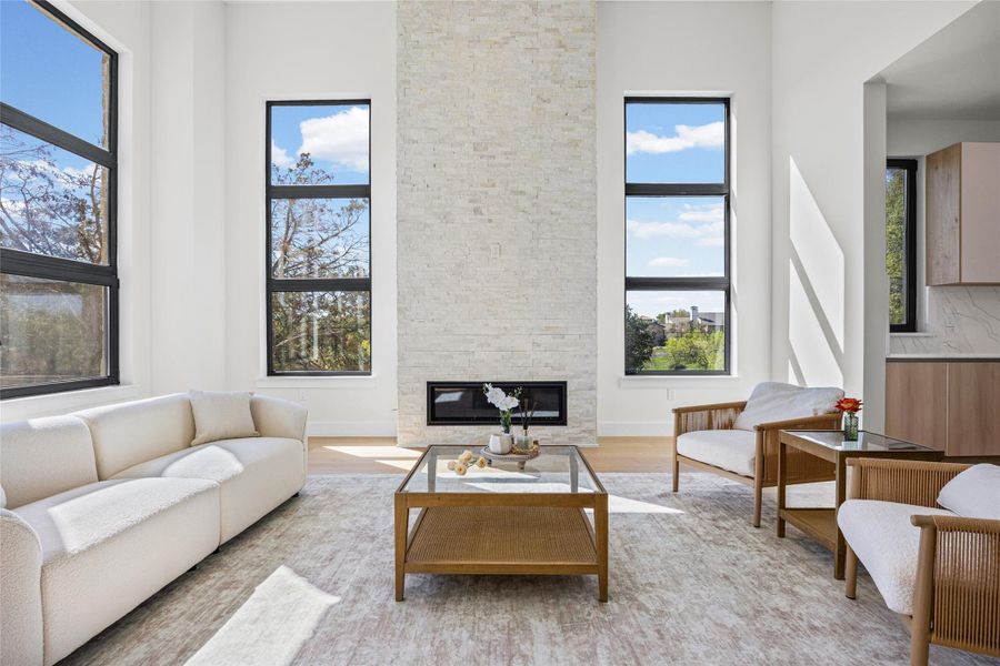 Inside, expansive windows fill the home with natural light, showcasing elegant hardwood floors that flow throughout the main living areas. The open-concept design creates an inviting atmosphere centered around a warm, sophisticated fireplace. The gourmet kitchen is designed for both style and functionality, featuring premium Bosch appliances, sleek custom cabinetry, and an oversized walk-in pantry with built-in shelving.