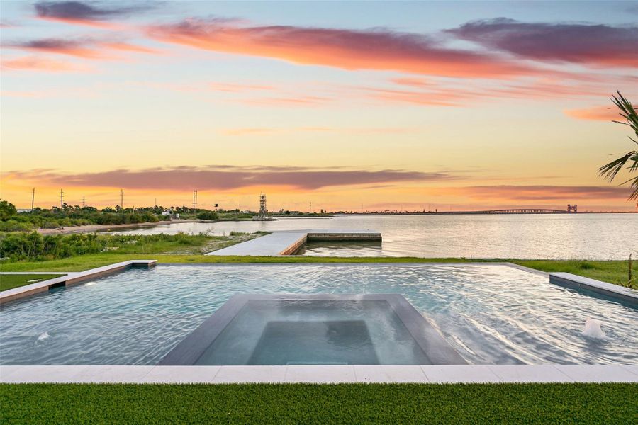 Stunning waterfront home offering panoramic views, an expansive open-concept design, infinity edge pool, and a private dock with a helicopter pad. Step inside this new construction home to find soaring ceilings, walls of windows that maximize the views, hardwood flooring throughout, extensive built-ins, and gorgeous designer finishes. The gourmet kitchen boasts double islands, professional grade appliances, abundant custom cabinetry, Neolith porcelain countertops, a built-in coffee bar w/a water hook-up, and a custom bar area w/an ice maker & beverage fridge. Luxurious primary suite, custom bunk room, custom built-ins in all closets, laundry rooms on both levels, beautiful bathroom designs, and more. Enjoy indoor-outdoor living with over 1,400 sq ft of covered porches. Spacious open garage can accommodate at least 7 vehicles. Enjoy sunsets over the water from the beautiful swimming pool, or fish off of the private dock that can also be used as a helipad or to dock your boat.