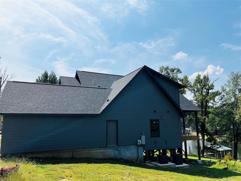 New construction, 95% complete, 2600 sf luxurious lake front home w/grand entrance into 18' ceilings leading to open concept living, dining, kitchen area that includes white limestone fireplace, magnificent 13' island covered w/granite, leather-textured countertops, custom cabinets; a walk-in pantry w/electrical outlets for appliances, water resistant wood floors, 3 bedrooms of which two would support two king size beds OR several bunk beds; 2.5 baths; which master bath exhibits free standing tub & open shower; all rooms have beautiful waterfront views. This house,was built for Hercules himself, Sits on solid pillars attached to concrete columns buried 3' into the ground (per Seller), the large covered porch is wrapped in cedar and there is an unbelievable concrete wall of armor surrounding the front of the home for additional protection, along w/french drains.This magical dream home has an integrated fire alarm, aerobic system 22x35attached garage, Dual a/c 3 ton & 4 ton units.
