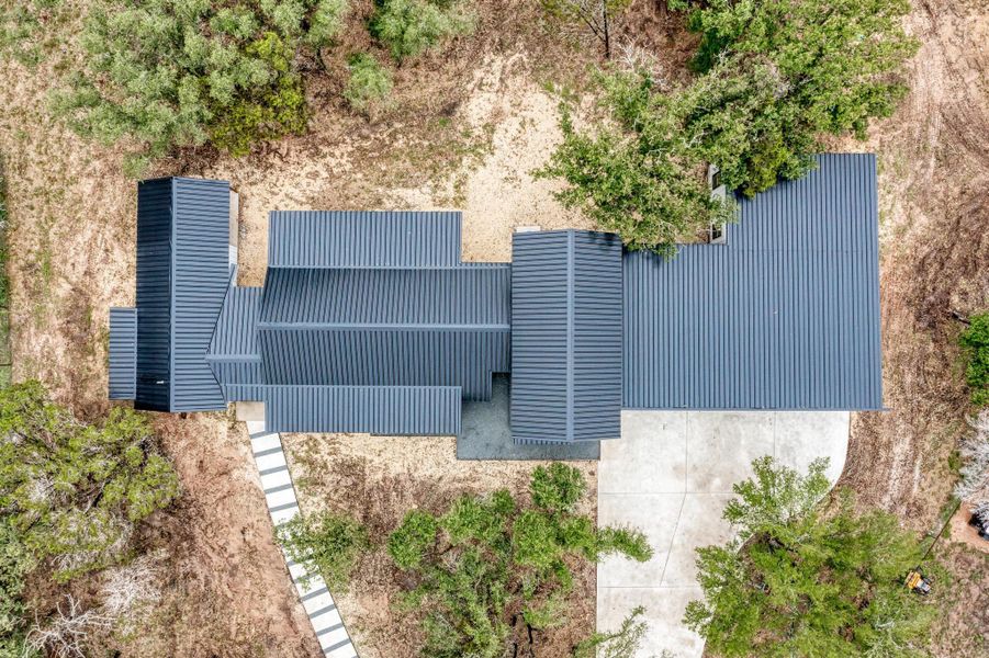 Nestled on a beautifully maintained 2.27-acre lot, this property features a cleared landscape accented by mature oak trees and partially pipe-fenced boundaries. Completed construction is a stunning, metal-custom-designed 3,200 sq ft main residence, offering 4 bedrooms, 3.5 baths, spacious living areas, and a versatile study/media/flex room. An additional 750 sq ft guest suite is attached to the 30x25 garage and includes 1 bedroom, 1 bathroom, a kitchenette (cabinets and countertop space-no appliances) , living area, and laundry room—perfect for extended family or guests. Also has a covered carport between the house and the main garage that will accommodate an RV. Enjoy over 1,600 sq ft of covered patio space, ideal for outdoor living and entertaining. A private well and septic system are installed, and a massive concrete driveway and metal landscaping were completed in May 2025. The home is move-in ready. Light deed restrictions allow for chickens, horses, RVs, and the potential for additional outbuildings. For more details or to schedule a private showing, please contact the listing agent. All plans and square footage are approximate and provided by the builder/owner. Buyers and their agents should verify all information, including deed restrictions and measurements.