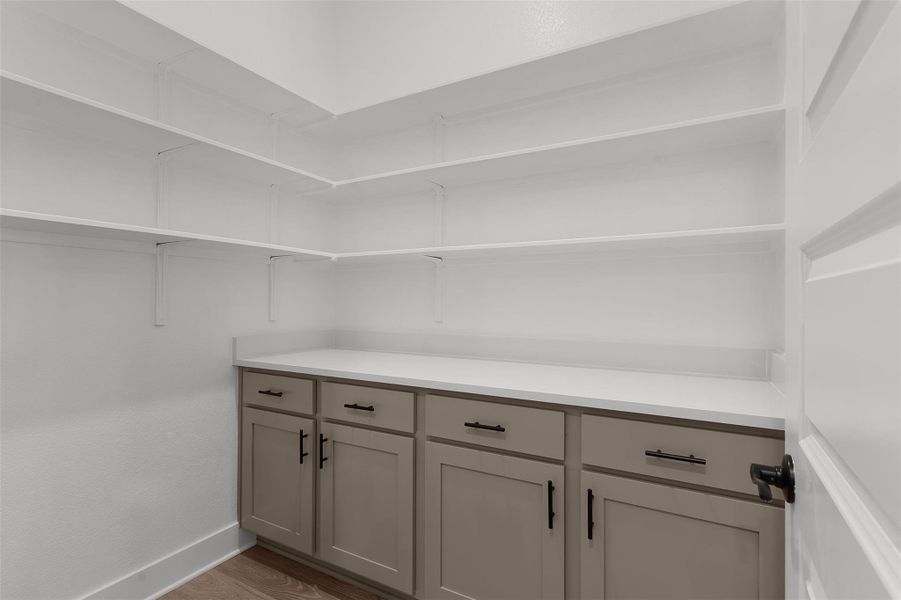 Enter through a long foyer that leads into a bright, open family room with a 60" electric fireplace with tile surround. The kitchen is thoughtfully designed with extra cabinet and counter space, a large center island, upgraded quartz countertops, soft-close cabinetry with matte black hardware, built-in appliances, and a walk-in pantry with an additional prep kitchen area—perfect for entertaining or extra storage.