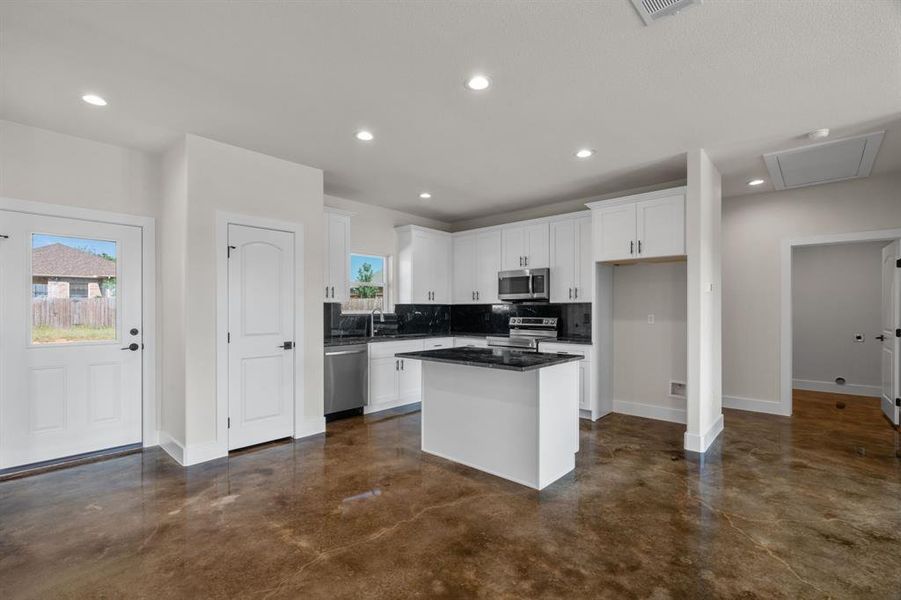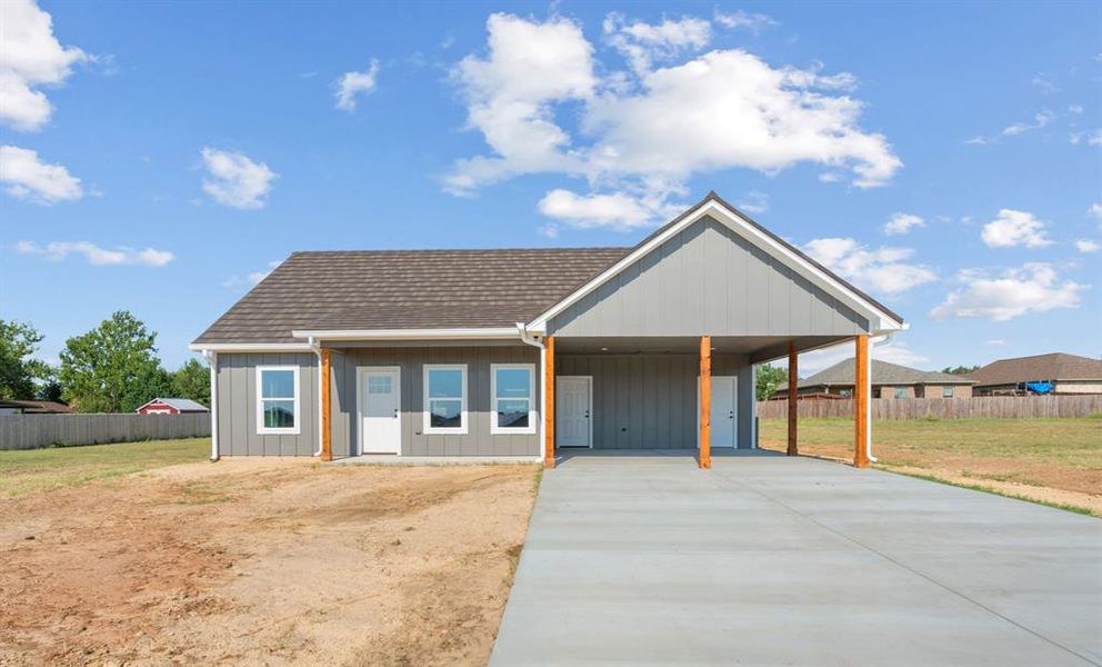 New Construction *** Energy-Efficient *** USDA Eligible!! Step into exceptional living with this beautifully crafted 3-bedroom, 2-bath new construction home designed to exceed all your expectations! The open-concept layout is perfect for entertaining or enjoying quality time with family, anchored by a spacious kitchen featuring a center island—ideal for meal prep or casual gatherings. Enjoy added privacy with a thoughtfully designed split-bedroom floorplan. Built with quality and efficiency in mind, this home includes spray foam insulation, 2x6 walls using a monopoly framing method for maximum structural strength and energy savings, and a Zip System sheathing for an air- and moisture-tight barrier from slab to roof. The exterior is as durable as it is attractive, finished with Hardie Board concrete siding and expertly waterproofed vinyl windows. Topping it all off is a stone-coated steel Tek-Roof with a Class 4 impact rating, hurricane-force wind resistance, and protection from hail up to 2 inches—providing peace of mind and helping lower insurance costs. Inside, rich walnut-stained concrete floors offer low maintenance and lasting beauty, while elegant quartz countertops add a touch of everyday luxury. Stay comfortable year-round with a high-efficiency 16 SEER Trane HVAC system and an Aprilaire Fresh Air System, ensuring superior air quality and energy performance. This home is more than just a place to live—it's a smart investment in quality, comfort, and long-term savings. Best of all, home qualifies for ZERO-DOWN USDA financing! Don’t miss your chance to own this energy-smart gem—schedule your tour today! Sod coming soon!!