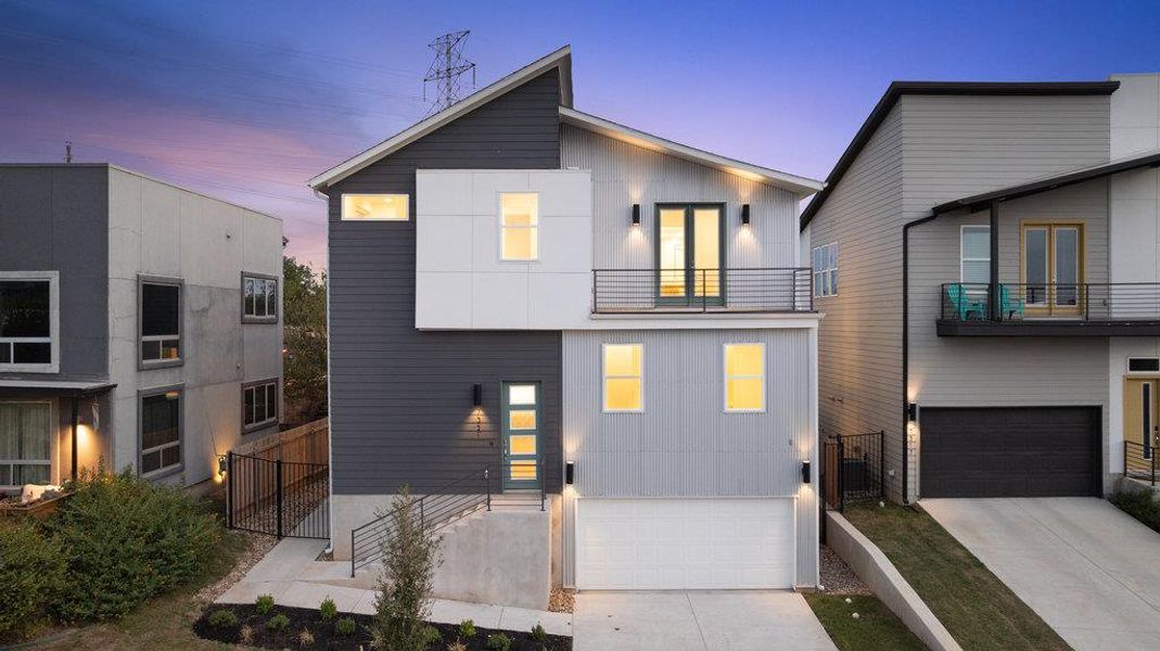 Modern East Austin home in Agave featuring a private balcony where you can enjoy sunset views of the Austin skyline, 4 bedrooms, 3.5 bathrooms, and new construction design—just minutes from downtown Austin, Tesla, and the airport.