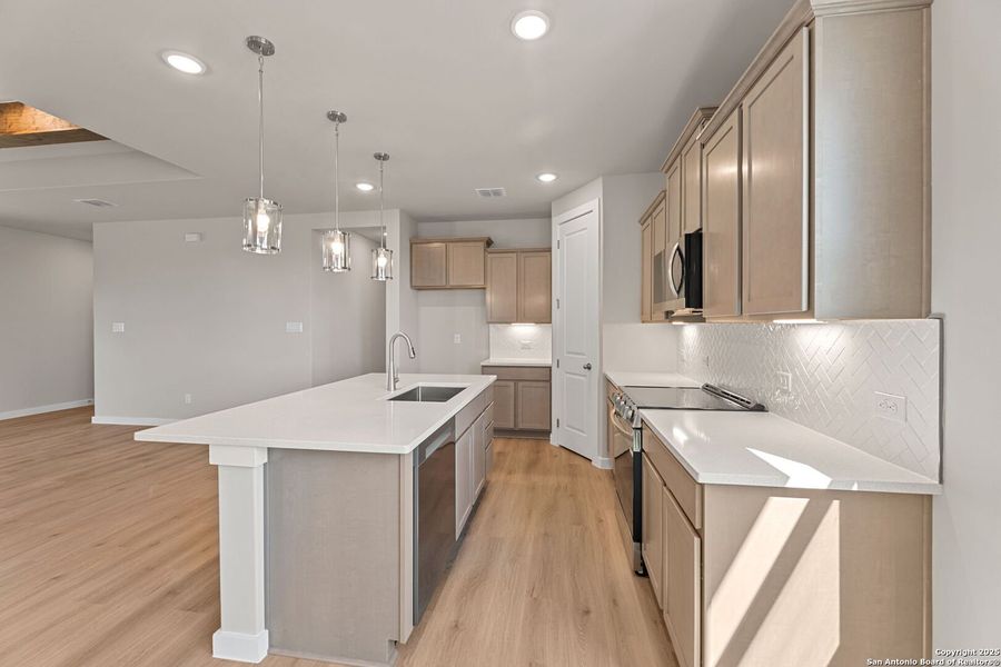 The Big Bend plan surprises with how spacious it feels the moment you step into the main living areas. Designed with entertaining in mind, this open-concept layout spans the full width of the home, offering a bright, airy environment that's both welcoming and versatile-whether you're hosting a large gathering or enjoying a quiet evening in. Natural light pours in from multiple directions, enhancing the comfortable, expansive feel. The split-bedroom layout promotes peace and privacy, with the Master Suite thoughtfully positioned at the rear of the home. This single-story home is filled with luxurious finishes and is easy to maintain. Highlights include wood beams in the coffered ceiling of the Great Room, 8-foot interior doors, and contemporary satin nickel plumbing fixtures that beautifully complement the soft, neutral interior palette. Throughout the main living areas, you'll find durable luxury vinyl plank flooring. In the kitchen, white quartz countertops, grey-stained Shaker cabinets, and a gleaming white chevron-patterned backsplash create a crisp, modern aesthetic. Pendant lighting over the island, a single-bowl stainless steel sink, and under-cabinet lighting add both functionality and charm. The primary suite includes a private en-suite bath featuring a walk-in tiled shower, a tall double vanity with drawers, and private water closet. The secondary bedrooms are located in their own wing, offering enhanced privacy and security, and share a bathroom complete with a tile-surround tub/shower combination and an extra-wide vanity for added convenience. Curb appeal is elevated with a recessed front entry, board-and-batten details, and brick accents, creating a charming and distinctive front elevation. Meet a New Home Advisor at our Hakes Brothers model home for more information on this home and for your own private tour today!