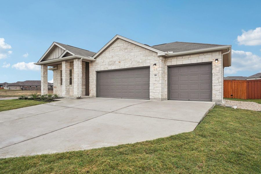 Introducing the Maverick, Milestone’s brand-new single-story floorplan. With light wood flooring throughout and 42” Shaker, soft closed cabinets, against quartz countertop, offset by designer backsplash. The over-sized covered patio includes a natural gas drop for grilling This home includes everything for you to move in and live comfortably. Separate closet specifically for storage alongside an office nook located outside the kitchen. Bedrooms are separated with no shared walls and a 3 car garage bay. Located in Crosswinds with a decked-out amenity park to include pool with adjacent splashpad, playscape, pickle ball court, half size basketball court and 2 dog parks. Future Elementary School as well. 5 miles from Tesla Supercharger and just 2 miles away from IH 35, Costco, Home Depot, HEB, and the many restaurants Kyle offers.