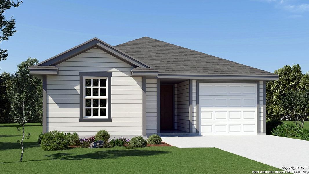 Step into The Tobin floorplan at Redbird Ranch in San Antonio, TX, a single-story home featuring 3 bedrooms and 2 bathrooms. The Tobin also offers 2 classic exterior with siding, a 1-car garage and 1412 square feet of comfortable living space. The Tobin features an open-concept layout that blends seamlessly to creat the perfect every day space designed with you in mind. An elongated foyer leads you to the kitchen and dining space before flowing into a grand living room. The kitchen features quartz countertops, gleaming stainless steel appliances, shaker style cabinets and an eat-in bar that overlooks the dining area. Your main bedroom suite is located off the living area toward the back of the home and includes a walk-in closet and a relaxing bathroom space. The ensuite bathroom includes a single vanity sink with a spacious quartz counter top, shaker style cabinets and combined shower and bathtub. You'll find quality carpet and spacious closets in all of your secondary bedrooms, located off the front foyer of the home. Use these rooms as offices, playrooms or other bonus spaces. Head out the back door located off the living room to find a fully landscaped yard with a state-of-the-art irrigation system. Additional features include sheet vinyl flooring in entry, living room, and all wet areas, quartz counter tops in all bathrooms and our HOME IS CONNECTED base package. Using one central hub that talks to all the devices in your home, you can control the lights, thermostat and locks, all from your cellular device.