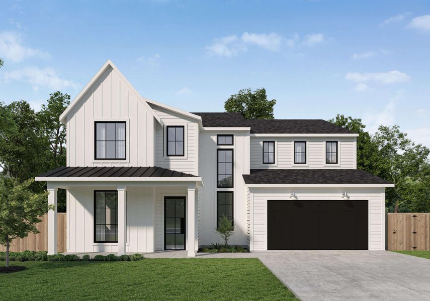 The Mason offers smart design with a prep kitchen for added convenience, a covered patio for outdoor living, and a versatile flex room. The spacious primary suite with a soaking tub, three additional bedrooms, and 3.5 baths provide ample space. With an extended garage, everyday entry, and large laundry room, The Mason is perfect for stylish, organized living. Rustic charm meets modern elegance in the Modern Farmhouse. With a steep roof, oversized windows, and a classic front porch, this design offers a welcoming and polished aesthetic.