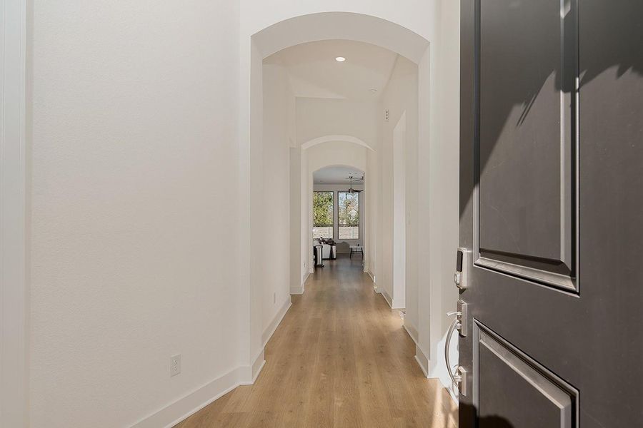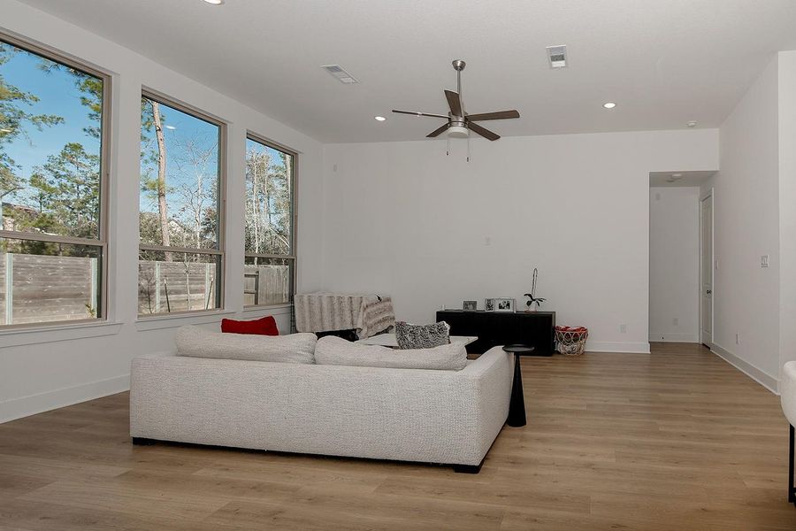 GREENBELT offers 3 spacious bedrooms, 2.5 bathrooms, study & an entertainment/media room that ensures plenty of space for work, relaxation & play. The gourmet kitchen is a chef’s dream that hosts a spacious island, loads of Quartz counter space, tons of cabinets & a generous walk-in pantry, perfect for storage. The cozy window seat in the dining area is perfect for hosting guests or enjoying a quiet moment. Appreciate the expansive wooded views from the central family room highlighted by picturesque windows. The luxurious primary suite boasts an attractive bay window with scenic views & an expansive closet. Outside, discover the covered patio and savor the privacy and tranquility of no rear neighbors. Additional features include upgraded, elevated ceilings, 8’ doors, 6” baseboards, tankless water heater & oversized garage. Enjoy all the world-class amenities of Artavia.