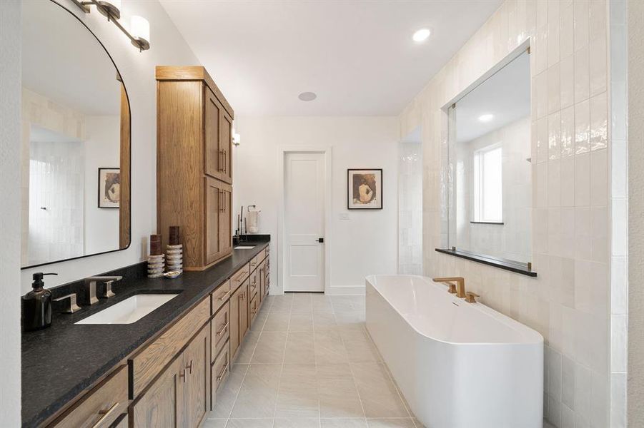 Welcome to this beautifully designed home in one of McKinney’s most sought-after communities, where elevated finishes and thoughtful design come together seamlessly. The main living area makes a lasting impression with soaring vaulted ceilings, exposed wood beams, a striking fireplace feature wall, and expansive sliding doors that create a seamless indoor-outdoor connection to the covered patio. The kitchen is both functional and refined, featuring a waterfall island, full-height cabinetry, designer lighting, and a premium appliance package, all opening effortlessly to the living and dining areas filled with natural light. A designated office with custom built-ins offers a polished work-from-home space, while a private media room provides the perfect setting for entertaining. The primary suite is privately positioned and showcases vaulted ceilings, abundant natural light, and a spa-inspired bath complete with a freestanding soaking tub, oversized walk-in shower, dual vanities, and extensive cabinetry. Upstairs, additional living space with an open-to-below design enhances the home’s airy feel and provides added flexibility. Additional highlights include a wet bar, wide-plank wood flooring, curated designer finishes throughout, and a layout designed for both everyday living and entertaining. Situated on a well-sized lot with a covered outdoor living area, this home offers a refined blend of modern style and comfort, all within close proximity to top-rated McKinney ISD schools, dining, shopping, and major commuting routes.