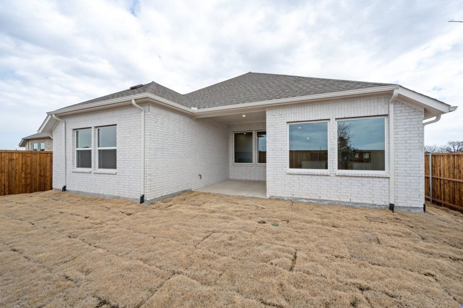 This 3-bedroom, 2-bath single-story home offers a smart layout with stylish finishes throughout. The white brick and stone exterior gives it great curb appeal, and inside, you’ll find a private study and an open-concept living space that’s perfect for both relaxing and entertaining. The family room features a 42" linear fireplace with a tile surround and box beam mantel, and flows easily into the kitchen, which includes white cabinetry, Bella Blanco quartz countertops, a glossy herringbone tile backsplash, and GE stainless steel appliances with a gas cooktop and built-in oven. Engineered hardwood flooring runs through the main living areas and study for a clean, polished look. The primary suite is tucked away at the back of the home and includes dual vanities and a large glass-enclosed tile shower. A covered patio with a gas drop is ready for your future BBQ grill, and the 3-car tandem garage offers extra storage or parking space.