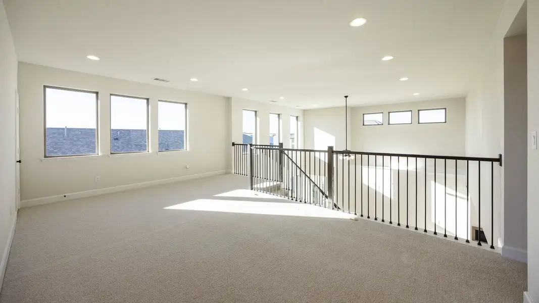 Welcoming front entry lined with three large windows. Home office with French doors off the entry. Inviting family room with 19-foot ceilings flows into the kitchen. Island kitchen with built-in seating, 5-burner gas cooktop and a corner pantry opens into the dining area. Private primary suite features three large windows and access to the utility room. The primary bathroom has dual vanities, a freestanding tub, a large separate glass enclosed shower, a linen closet, and two walk-in closets. Upstairs includes a game room, secondary bedrooms with a Hollywood bathroom, and a guest suite. Covered backyard patio and 8-zone sprinkler system. Mud room just off of two-car garage.