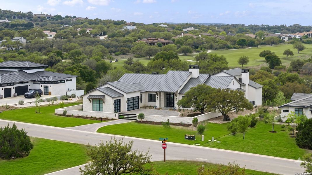 This home has a FULL MASTER GOLF MEMBERSHIP AVAILABLE FOR PURCHASE Situated in the well-known Cordillera Ranch neighborhood, and backing up to the 12th hole of the Jack Nicklaus Signature Golf Course, this custom residence by Atkinson Custom Homes blends Hill Country elegance with high-end luxury living. Scheduled to be move-in ready October of 2025, this home is a true showpiece in the making. The home is fully equipped and Josh.ai ready, offering seamless smart home integration throughout. A private gated courtyard with antique barnwood timber awnings and commercial-grade LiftMaster gate opener sets the tone. The oversized paver driveway offers generous parking and striking curb appeal. Inside, you'll find a seamless open-concept layout with wide plank oak floors and antique barnwood timbers and trusses throughout. The gourmet kitchen and full back kitchen are outfitted with Wolf appliances, including a 48" range, steam oven and speed oven, coffee system, two dishwashers, Subzero refrigeration, and a massive 11' island beneath a polished limestone vent hood. The living room features rock walls, antique oak timbers, and a masonry fireplace with a polished limestone mantle, opening to an oversized dining area. A standout feature of the home is the 1,536 sq. ft. game room with 26' cathedral ceilings, rock walls, barnwood hammer trusses, a masonry fireplace, and a full bar with luxury countertops, waterfall panels, Subzero appliances, and 102-bottle wine storage. The primary suite is a private retreat with outside access, along with a spa-inspired bath wrapped in tile, an undermount tub, oversized frameless glass shower with bench seating, and a fully built-out walk-in closet. Each guest bedroom includes its own en suite bath. Additional highlights include a large utility room with dual washers/dryers, a dedicated 117 sq. ft. storage room, built-in window screens, and premium-grade finishes throughout. Outside, enjoy a grand covered patio with a fireplace, three living zones, retractable sun screens, a built-in kitchen with infrared grill, and a three-level heated pool and spa with negative edge and sun deck. Artificial turf, and landscape architect-designed flower beds complete the backyard oasis. The oversized 3-car garage features EV and car-lift power, tall ceilings, storage space, and a dedicated shop area. A true showpiece, crafted for luxury living and effortless entertaining.