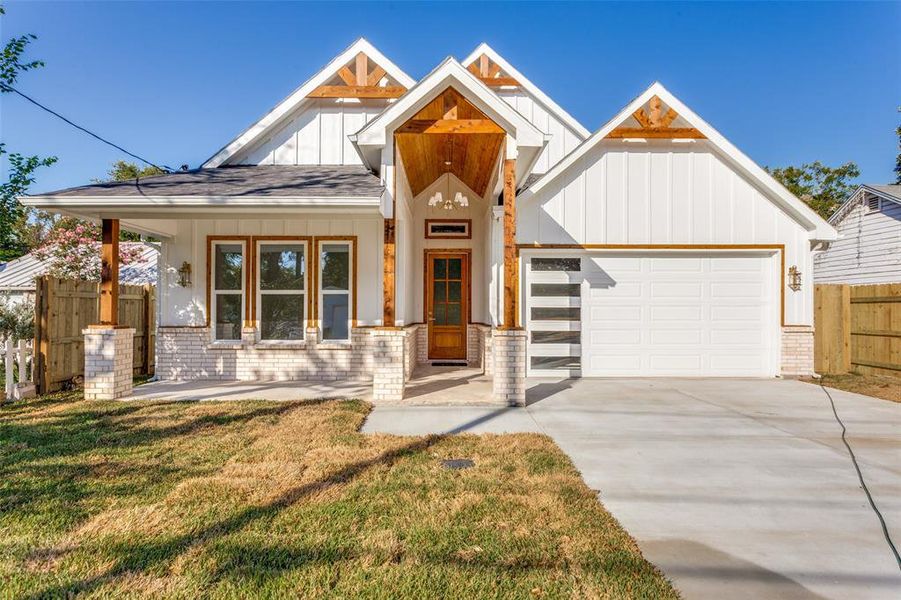 Welcome to your dream home! This beautifully crafted 4-bedroom, 2-bathroom new construction offers modern comfort, timeless design, and thoughtful details throughout. Step inside to an open-concept floor plan with soaring vaulted ceilings accented by striking cedar beams. The spacious living area features an elegant electric fireplace with a custom mantle, perfect for cozy evenings or entertaining guests. The heart of the home is the gourmet kitchen, complete with custom wood cabinetry, a large quartz island, and premium finishes that blend style and functionality. 8-foot doors throughout the home add to the sense of space and sophistication. Retreat to the luxurious master suite featuring a coffered ceiling, designer lighting, and a bold accent wall. The spa-like master bath includes a double vanity, an oversized tiled shower with a sleek glass barn door, and a large walk-in closet with ample storage solutions. Three additional bedrooms offer plenty of space for family, guests, or a home office. Enjoy relaxing mornings or evening chats on the welcoming front porch and take advantage of the large backyard—ideal for entertaining or future landscaping dreams. This home is a perfect blend of craftsmanship and comfort. Don’t miss your chance to make it yours!