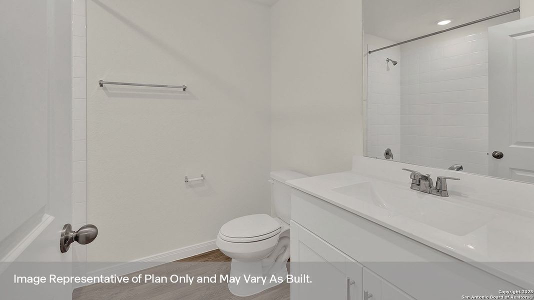 JUNE ESTIMATED COMPLETION. Check out the Harris floorplan, our largest one-story home available at Paramount in Kyle, Texas. Perfect for roommates or larger families, this 4 bedroom, 2.5 bathroom, 2 car garage home offers 1,822 square feet of comfortable living space. Our homes in Paramount feature our modern farmhouse exteriors. At the front of the home, off the foyer, you have two secondary bedrooms and a full bathroom, which includes a shower/tub combination. Moving through the foyer and down a small hall, you will find the half bathroom, utility room and another secondary bedroom. All secondary bedrooms feature a closet with shelving. Whether you use these rooms as an office, child's room or guest room, there is plenty of space for work, sleep, and play. Making your way through the house, you'll walk into the heart of the home, the living area. Built as an open concept, move easily between the kitchen, dining, and family room. The L-shaped kitchen includes quartz countertops, a large island with undermount sink, a corner pantry closet, stainless-steel appliances and 36'' upper cabinets. The primary bedroom is located off the family room. This spacious bedroom will be your oasis at the end of a long day. Enjoy the private bathroom, which features a walk-in shower, marble countertops with dual vanity, separate toilet area with a door, and a large walk-in closet. The Harris includes vinyl flooring throughout the common areas of the home and carpet in the bedrooms. All our new homes at Paramount feature extra storage space in the garage, a covered back patio, full sod, and an irrigation system in the front and back yard. This home comes with our America's Smart Home base package, which includes Video Front Door Bell, Front Door Deadbolt Lock, Home Hub, Thermostat, and a Smart Swit
