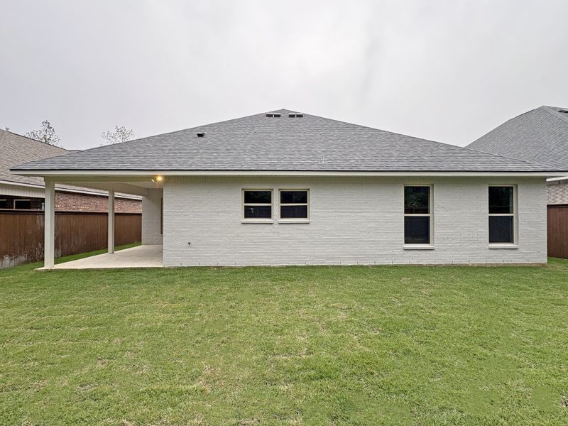 separate den off of the living room. Upgrades for this home include stainless appliances with a gas range, granite countertops throughout, wood plank tile flooring and more! Features: double vanity, garden tub, separate shower, linen closet, and a large walk-in closet in the primary suite, primary closet has a second entrance at the laundry room for added convenience, double vanity in the second and third bathrooms, a kitchen island overlooking the living room, spacious walk-in pantry, boot bench at the garage entry, covered front porch, covered rear porch, recessed lighting, undermount sinks, birch standard-overlay cabinets with hardware throughout, custom tiled shower with frameless shower door in primary bathroom, framed mirrors for all bathrooms, ceiling fans in the living room and primary bedroom, smoke and carbon monoxide detectors, smart connect Wi-Fi thermostat, post tension slab, automatic garage doors with 2 remotes, landscaping, architectural 30-year shingles, flood lights, and more! Energy Efficient Features: a tankless gas water heater, low E tilt-in windows, and more!