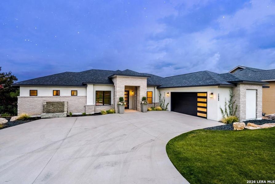 Prepare to be captivated by this stunning new build in The Summit, where modern luxury meets Hill Country serenity. With 2,916 sq ft of expertly designed space, this home features sleek mid-century architecture blended with warm natural elements. The spacious great room flows into a breakfast dining area and a chef's kitchen with gas cooking, a waterfall island, stainless steel appliances, abundant cabinetry, and a walk-in pantry. The primary suite is a peaceful retreat with dual closets and a spa-inspired bath offering a large walk-in shower with dual shower heads. Additional highlights include generous secondary bedrooms, a formal dining room, a flexible study/4th bedroom with ensuite bath, a laundry room, and 220V EV charging in the garage. Step onto the expansive back deck to enjoy beautifully landscaped surroundings, while a lighted fountain graces the front of the home with charm. A rare find-modern, functional, and ready to welcome you home.