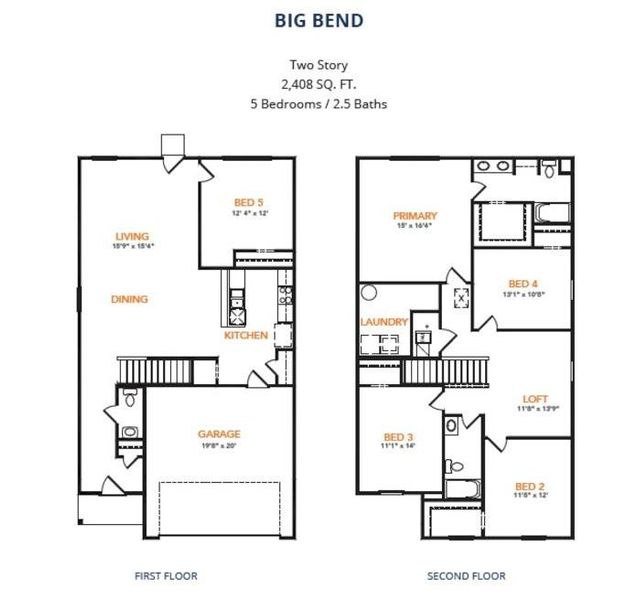 MLS# 21013142 - Built by NHC - Feb 2026 completion! ~ The Big Bend plan offers 5 bedrooms, 2.5 bathrooms, and 2,408 square feet of thoughtfully designed living space in a versatile 2-story layout. As you step inside, you’ll pass the convenient half bathroom and staircase to the upper level before entering the open-concept living area. This space includes a well-appointed kitchen with a central island, a dining area, and a spacious family room perfect for family time or entertaining. Tucked off the family room, a flexible bedroom can serve as a guest room, office, or playroom to suit your family’s needs. Upstairs, you’ll find the expansive primary suite featuring a walk-in closet and private bathroom, offering a tranquil retreat. The upper level also includes three secondary bedrooms, a full bathroom, a generous loft for additional living space, and a conveniently located laundry room.