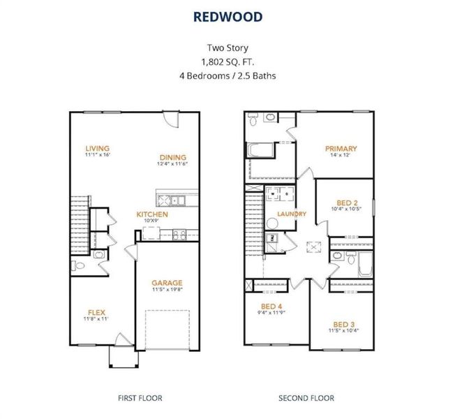 MLS# 21012807 - Built by NHC - Ready Now! ~ The redwood plan delivers spacious comfort and smart design, ideal for modern living. This 2-story home offers 4 bedrooms, 2.5 bathrooms, a 1-car garage, and 1,802 square feet of thoughtfully crafted living space. As you step inside, you’ll pass a versatile flex room, perfect for a home office or playroom, and a conveniently located half bathroom. The hallway opens to a bright and airy living area where the kitchen, complete with an island, overlooks the dining area and family room, creating the perfect backdrop for family time and entertaining. The stairs, located in the family room, lead to the upper level. Here, you’ll find the private primary suite, complete with a bathroom and walk-in closet. Three additional bedrooms, a full bathroom, and the conveniently located laundry room complete this level, ensuring functionality for your daily routines.