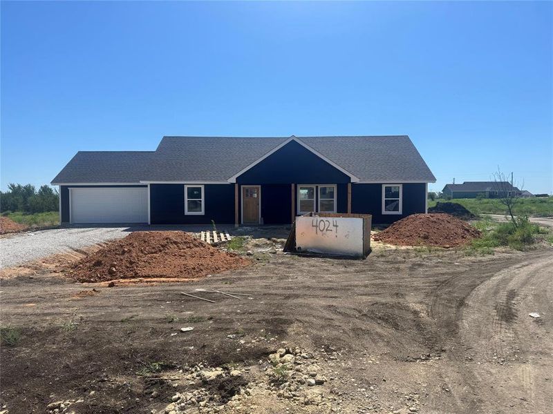 New Build on just over one acre. This open floor plan has 3 bedrooms, 2 bathrooms. The kitchen has stained custom cabinets, a island and stainless steel appliances. There is tile throughout the home with carpet in the bedrooms. The master bath has a walk-in shower, double sinks and a walk-in closet. Large laundry room with door leading to the garage. Back door leads to a large back yard. NO HOA! Located close to Weatherford and Ft Worth.