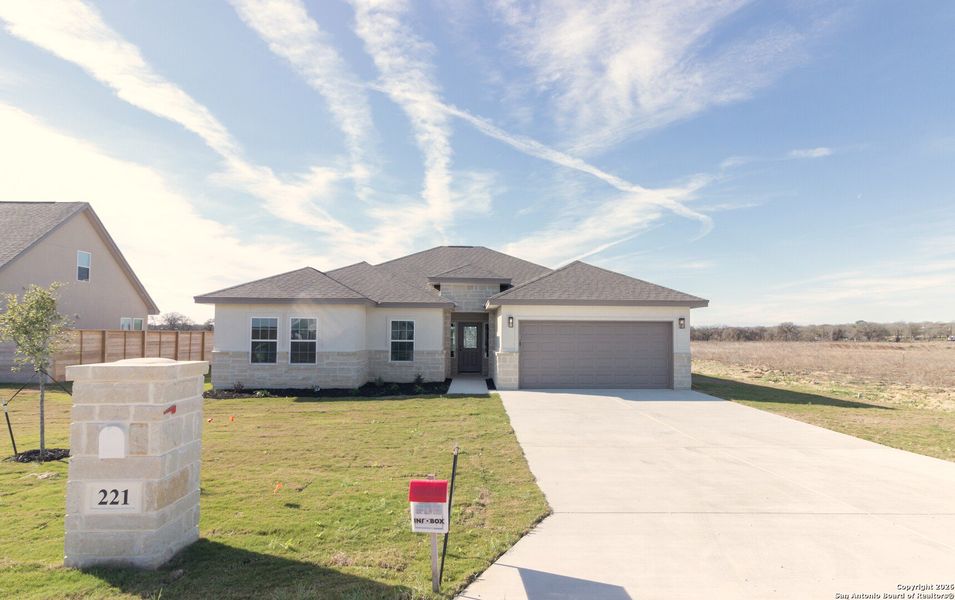 Move-in ready now (completed in Nov. 2025)! Custom 1861 SqFt. home located in Las Palomas Country Club Estates. Luxurious home with 4 bedrooms 2 full bathrooms. Level, quiet countryside 0.23 acre lot in La Vernia ISD. Large master suite with extra large walk-in closet, garden tub, full-tile shower and double vanity. Kitchen features an oversized island, custom wood stained cabinets, walk-in pantry and dining area. Upgraded features like granite countertops throughout, tall 9 ft ceilings, tray ceilings in some rooms, wood-look ceramic tile throughout with carpet in secondary bedrooms. Exterior of home will be stucco with stone 42" tall across the front of the home. Full landscaping with sprinkler system included plus a covered back porch with two sides enclosed for extra privacy! This home includes 2-10 warranty and upgrades worth over $15,000 in value! Schedule a tour today of this high-quality home!