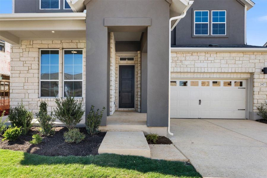 Welcome to this spacious 2,855 sq. ft. home that blends timeless design with modern features, offering the perfect retreat for families and entertainers alike. This thoughtfully designed 4-bedroom, 3-bathroom residence includes a private study and a game room, providing ample space for work, relaxation, and play. Step into an inviting open-concept living space featuring soaring 20-foot ceilings in the living room, filled with natural light. The heart of the home is the gourmet kitchen, boasting 63-inch white cabinetry, 3cm marble countertops, built-in stainless steel gas appliances, and a stunning island ideal for casual dining or entertaining. The light wood flooring throughout the main areas adds warmth and sophistication, extending gracefully up the staircase with a wood tread and vertical open stair railing for a sleek, modern touch. Enjoy the convenience of two bedrooms on the first floor, including the luxurious primary suite, where you’ll find a spa-inspired bathroom adorned with 2x8 siren green wall tile in the spacious shower, and elegant finishes. The secondary bathroom features stylish blue picket and white subway wall tile with quartz countertops, adding a designer flair. Additional highlights include 8-foot interior doors on the first floor, an abun-dance of storage, and a versatile game room upstairs—perfect for movie nights or a play area. Located just minutes from downtown Buda, schools, parks, and an easy commute to Austin, this home combines small-town charm with modern convenience. Located in a beautifully designed, tree-lined neighborhood with community amenities such as pools, indoor gym, pickle ball courts, parks, walking trails, direct access to Garlic Creek and top-rated schools, this home is ideal for families, professionals, or anyone seeking a peaceful lifestyle with easy access to city conveniences. Estimated December 2025 Completion