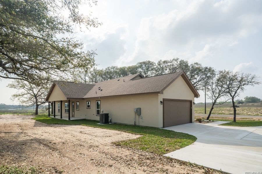 Situated on a one-acre lot in Floresville, Texas, this 2,197-square-foot home seamlessly blends modern comfort with natural beauty. Surrounded by mature trees, including a majestic oak in the backyard, the home features spacious front and back porches ideal for enjoying quiet mornings or picturesque sunsets. Inside, there are 3 bedrooms, 2 bathrooms, a mudroom, and a versatile study or flex room. Modern amenities include video surveillance, A/V pre-wiring, and foam insulation, which enhances energy efficiency and comfort by maintaining consistent indoor temperatures and reducing cooling costs-an essential advantage in Central Texas' hot climate. Additional high-end touches include soft-close custom wood cabinets, porcelain wood-look tile flooring, and a stunning stacked-stone fireplace. The kitchen boasts a large granite island with a matching backsplash, while the luxurious master bathroom features marble floor-to-ceiling shower tile. The garage will include a durable polyurea floor coating and an EV charging outlet, providing convenience and future-ready infrastructure for electric vehicle owners.
