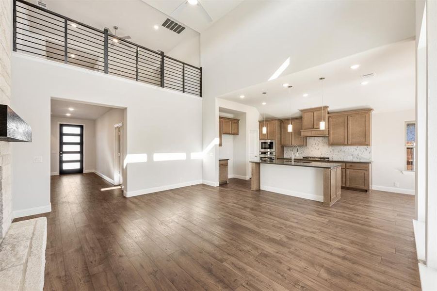 6% Seller Contribution! Apply it toward closing costs or a rate buydown. Restrictions apply, see Community Manager. NEW! NEVER LIVED IN. Ready for Move-In. The Violet IV by Bloomfield Homes delivers space, flexibility, and thoughtful design across two levels, offering 5 bedrooms and 4 full baths. With a 2.5-car garage and brick and stone façade, this home has serious presence from the curb. Step through the 8’ front door into a wide foyer and you’ll find upgraded laminate wood flooring flowing throughout the common spaces. A private bedroom and full bath are tucked just off the entry—ideal for multigenerational living or guests. The main living area opens dramatically, with the Family Room soaring to the second floor and anchored by a Ledge Stone-to-Ceiling fireplace, while vaulted ceilings and a view of the upstairs Game Room create striking vertical volume. The Kitchen is built for both everyday use and entertaining, with Level 3 Quartz countertops throughout, stainless steel appliances, built-in oven and microwave, a 5-burner gas cooktop, pot & pan drawers, and a deep walk-in pantry. The adjacent Dining space is positioned for seamless indoor-outdoor access to the covered patio, where a gas stub allows for effortless grilling. The Primary Suite sits at the back of the home for privacy and features dual vanities, a garden tub, separate shower, and walk-in closet—all highlighted by upgraded tile and comfort-height toilets. Upstairs hosts 3 additional bedrooms, 2 full baths, and generous living spaces including a Game Room and separate Media Room. Storage is built-in throughout, and practical features like a tankless water heater, mud bench in the laundry, and 4 uplights at the front of the home round out the list of elevated details. Located in Addison Hills with access to trails, green space, and playgrounds—this home is a standout in every way.