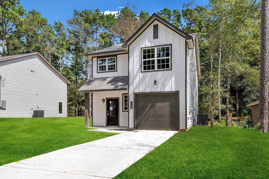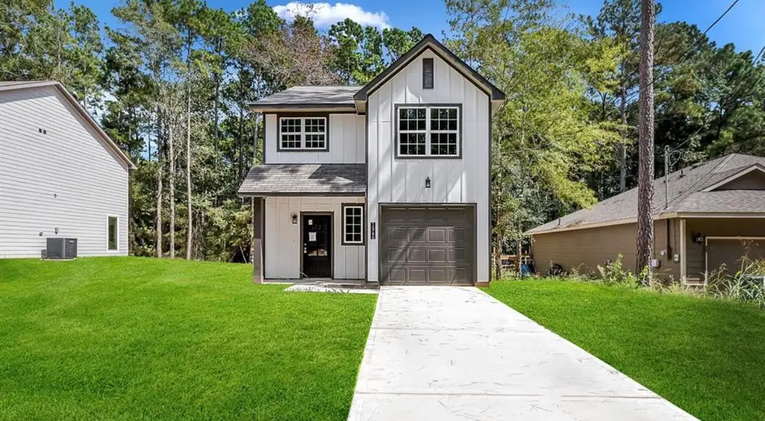 Upstairs, the spacious primary suite includes a large walk-in closet and a luxurious bathroom with dual vanities and an oversized shower. Each bedroom comes with ceiling fans, and the home is filled with natural light from large windows. Additional upgrades include tech shield decking for energy efficiency, blinds throughout, and an oversized 8-ft garage door.Step outside to a fully sodded backyard with no rear neighbors, as the property backs to the scenic Sam Houston National Forest.offering added privacy and beautiful views. Located in the Hidden Forest community, residents enjoy access to a park, pool, and lake for year-round recreation.