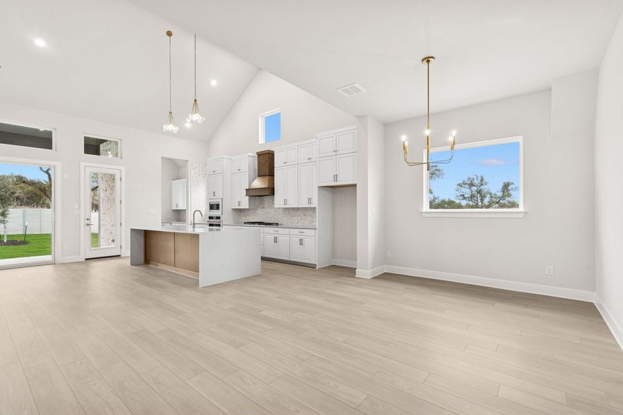The expansive kitchen is designed to impress, featuring sleek finishes, abundant counter space, and a large island that flows effortlessly into the dining and family rooms, creating a warm and welcoming space for entertaining or casual gatherings.
