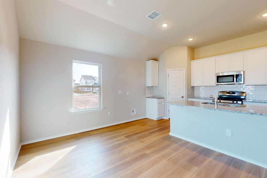 • Open-concept floorplan connecting living, dining, and kitchen areas