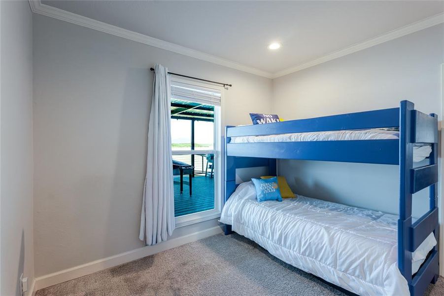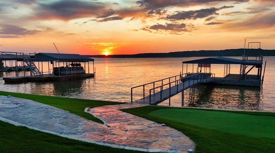 Lake life is made easy with a DEEP WATER, two-story dock in 20+ feet of water, a wheelchair-friendly thoughtfully designed ramp to the dock with NO STAIRS so everyone can join in the lake fun, and a premium TURF YARD featuring a waterfront PUTT PUTT COURSE. The grassy backyard play space is visible from double porch swings.