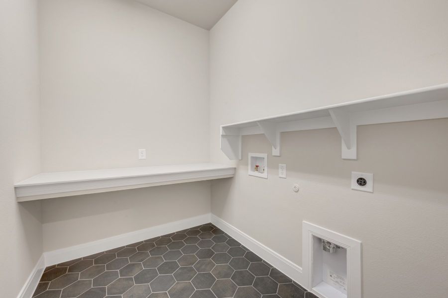 The chef’s kitchen provides a dine-up island and plenty of storage and prep space, complete with stacked cabinetry. Make Laundry easy with a folding station next to your washer-dryer.