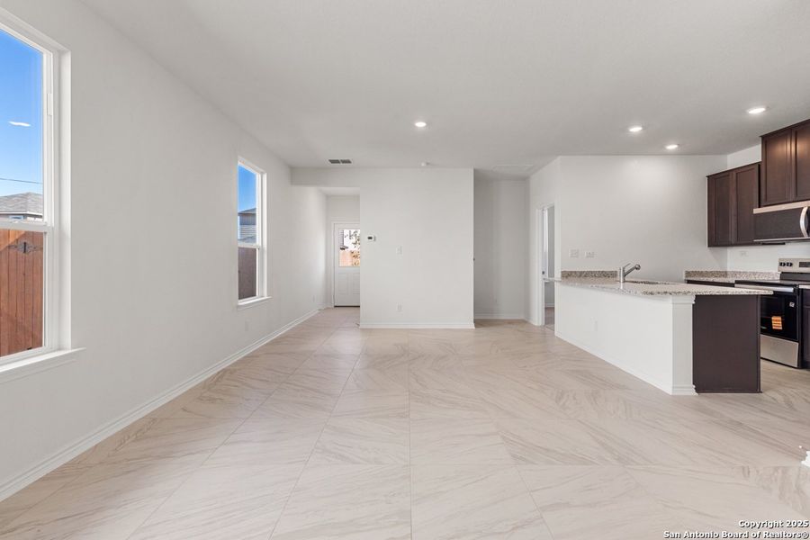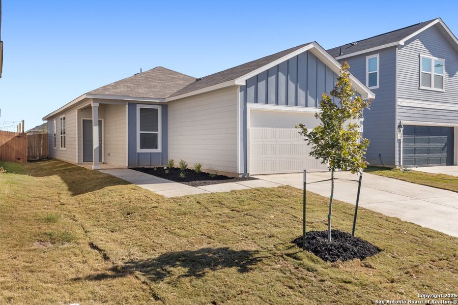 This stylish home features 9-ft. first floor ceilings that enhance its spacious feel. The kitchen showcases Whirlpool stainless steel appliances, Woodmont Belmont 42-in. upper cabinets, granite countertops in Arctic Pearl, and an extended breakfast bar. In the primary bath, enjoy upgraded cabinets, and a 42-in. garden tub/shower with a Daltile tile surround. Decorative touches include a Carrara-style entry door, Kwikset Polo knob interior hardware, and Perpetuo ceramic tile flooring throughout the bathrooms, kitchen, and great room. A wireless security system adds peace of mind, while a fully sodded yard and automatic sprinkler system offer outdoor ease.
