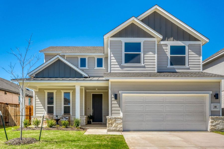 The Beau plan combines functionality with comfort, featuring 2,089 square feet across two stories. This spacious design includes three bedrooms, two and one-half bathrooms and an upstairs loft for added flexibility. The open-concept main floor and private primary suite create a functional and comfortable living space. Additional features on the home include spray foam insulation and pre-plumbing for water softener, full sod with full smart sprinkler system. Convenient onsite elementary school, amenities including luxury pool, parks, outdoor kitchen, club houses all in a hill country setting.