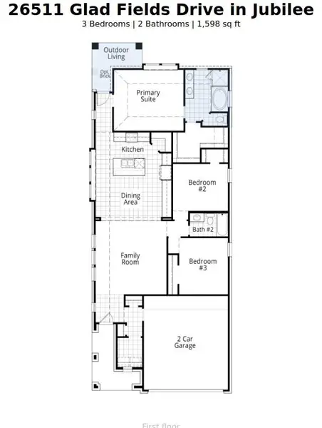 Carlton plan built by Highland Homes, featuring 1,598 sq ft, single story with 3 bedrooms, 2 baths and 2 car garage.