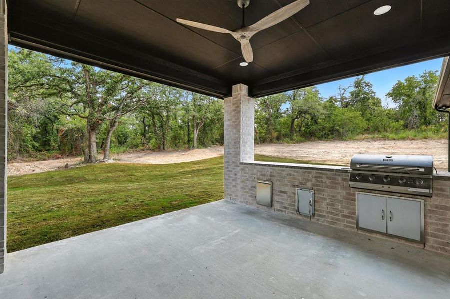 The gourmet kitchen is designed for both function and style, featuring 10’ cabinets to the ceiling, soft-close cabinetry, a custom built-in refrigerator, gas range, microwave, and dishwasher.