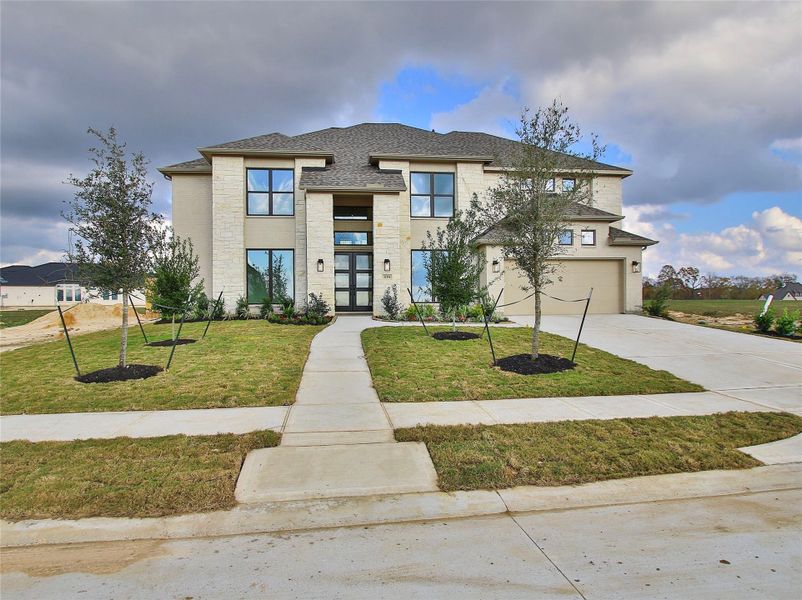 READY FOR MOVE-IN! The grand entryway unfolds to reveal a sweeping curved staircase. French doors open into a home office, while across the hall, the formal dining room awaits. Step into the two-story family room, which offers a warming wood mantel fireplace and a wall of windows. The morning area connects the living space to the kitchen, which boasts an island with built-in seating, 5-burner gas cooktop, double wall oven, a walk-in pantry, and a butler's pantry. The primary suite features a wall of windows. This retreat includes dual vanities, a freestanding tub, a separate glass-enclosed shower, and two walk-in closets. A private guest suite off the morning area provides comfort. Upstairs, discover a game room with windows and an adjoining media room for entertainment. Secondary bedrooms with walk-in closets and a Hollywood bathroom, along with an additional guest suite. Step outside to the extended two-story covered backyard patio. A mudroom is just off the three-car garage.